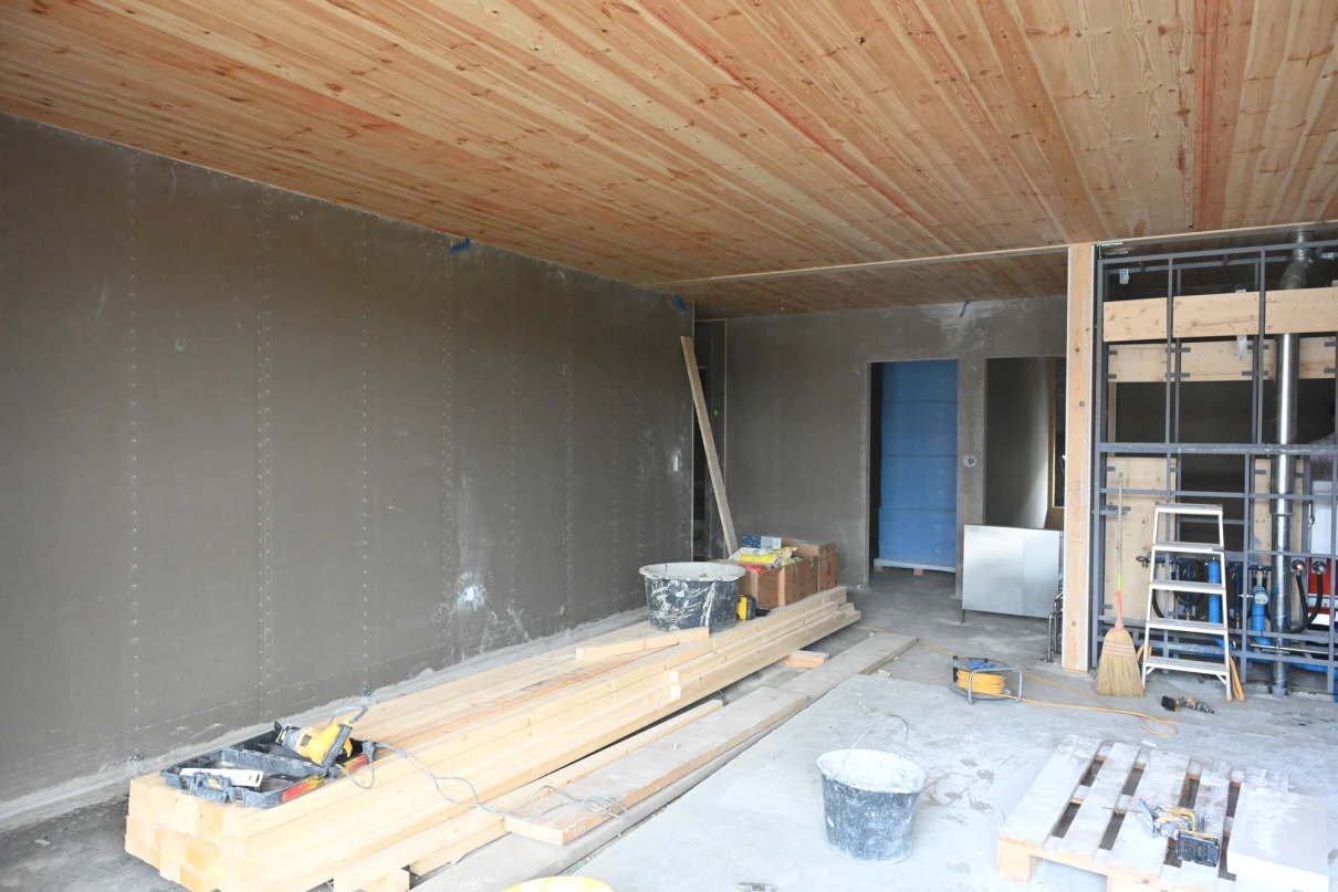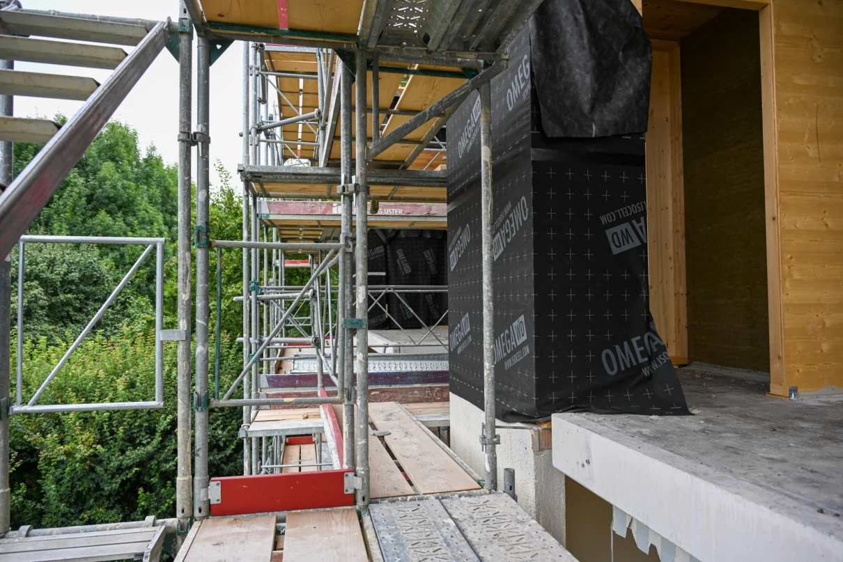 Das Haus Nr. 39 wird zusätzlich in Holzbauweise um ein Geschoss aufgestockt. Für diesen Bauteil übernehmen wir neben den genannten Arbeiten auch die erforderlichen statischen Verstärkungen sowie die Fräsarbeiten für die Erhöhung des Treppenhauses.