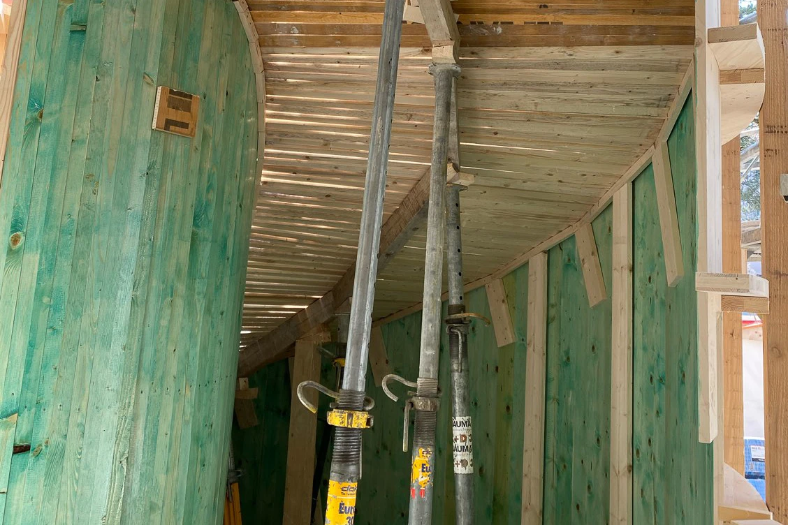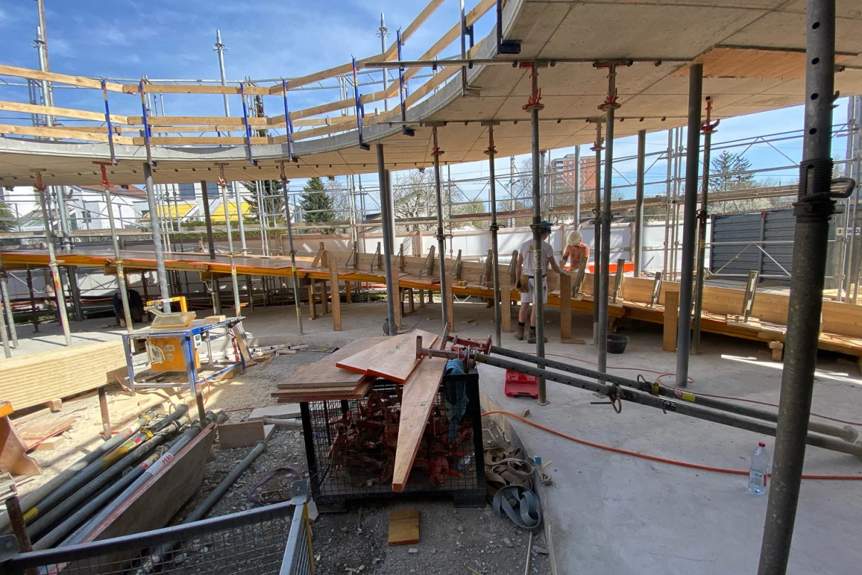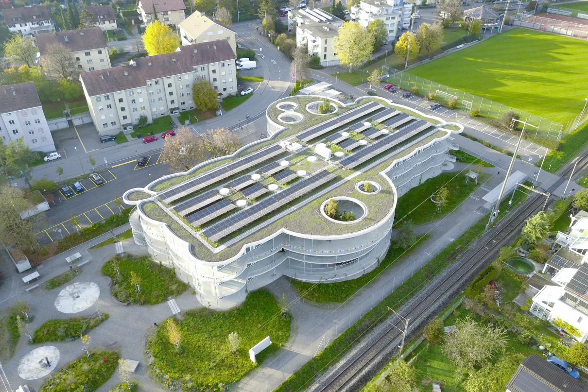 Das Schulhaus Wallrüti ist ein dreigeschossiger Pausen- und Lernbereich in Form umlaufender wolkenförmiger Laubengänge mit hängender Gärtenbepflanzung, welche die Relation des Klassenzimmers zum Aussenraum neu als Freiluftschule definiert.