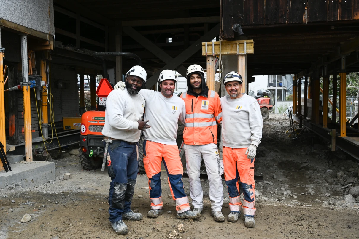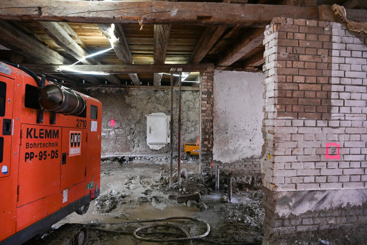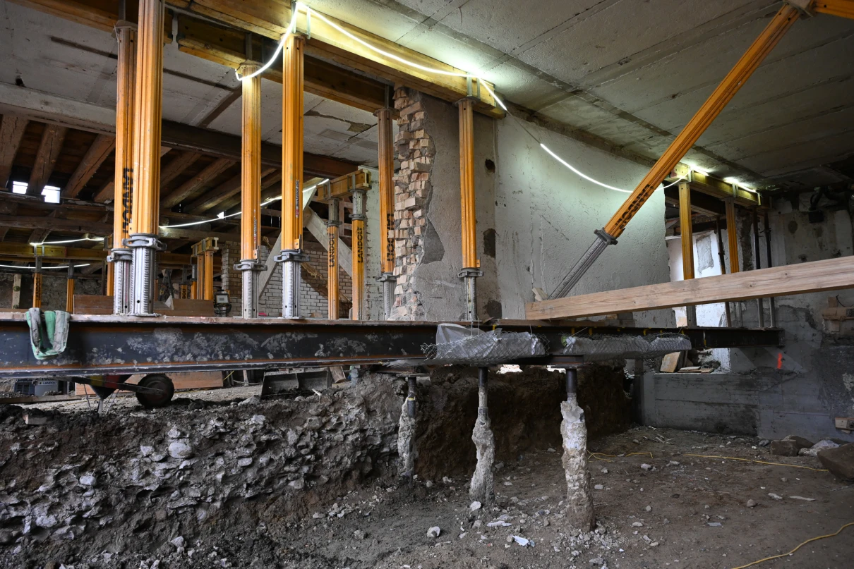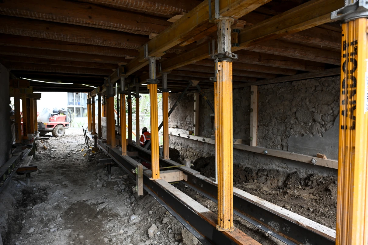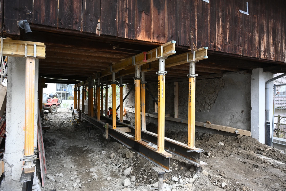 Die rustikalen Wände der Scheune werden nun mit Stahlträgern auf die Pfählung abgestützt, um das Fundament rund vier Meter tiefer legen zu können. In den dadurch entstehenden Räumlichkeiten sollen zukünftig moderne Wohnungen entstehen. Mit großem Interesse und Spannung verfolgen wir den fortschreitenden Bauprozess und sind gespannt, welche weiteren Überraschungen dabei noch ans Licht kommen.