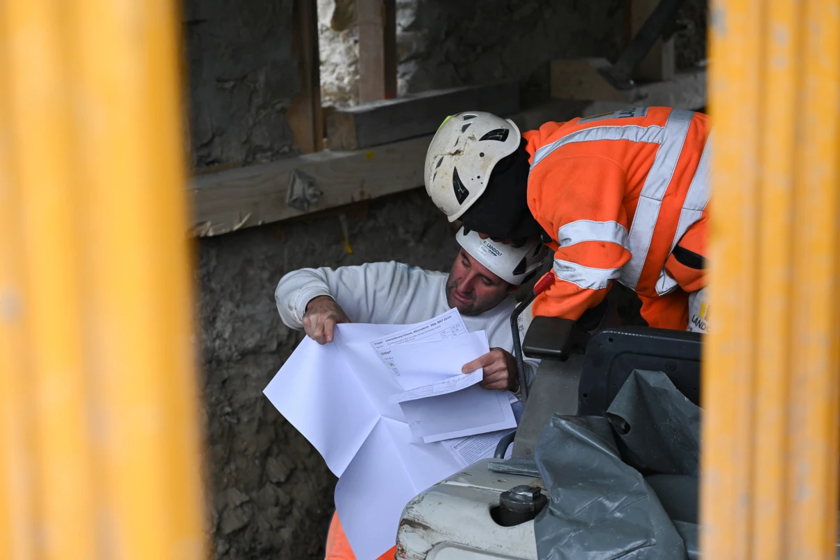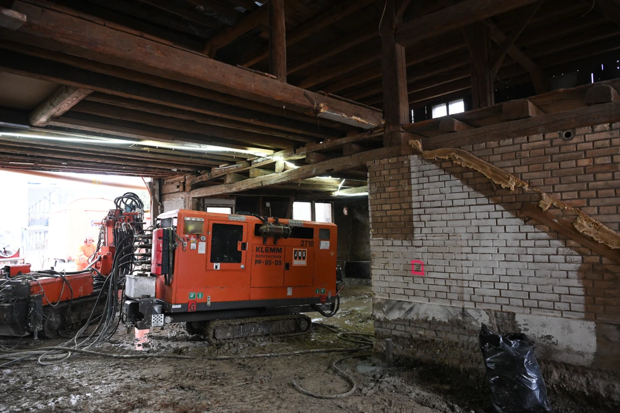 Die Aussenwände sowie der gesamte obere Dachboden dieser historischen Scheune stehen unter Denkmalschutz, weshalb ihre Sanierung eine besondere Herausforderung darstellt. Mit viel Sorgfalt und teils maschineller Unterstützung wird das Gebäude aufwendig renoviert. Besonders faszinierend ist, welche Entdeckungen im Erdreich gemacht werden. So wurde während der Pfählungsarbeiten das Skelett eines Pferdes gefunden, was zu weiterführenden archäologischen Untersuchungen führte. Zudem wurde ein altes Güllenloch freigelegt, abgebaut und fachgerecht entsorgt.
